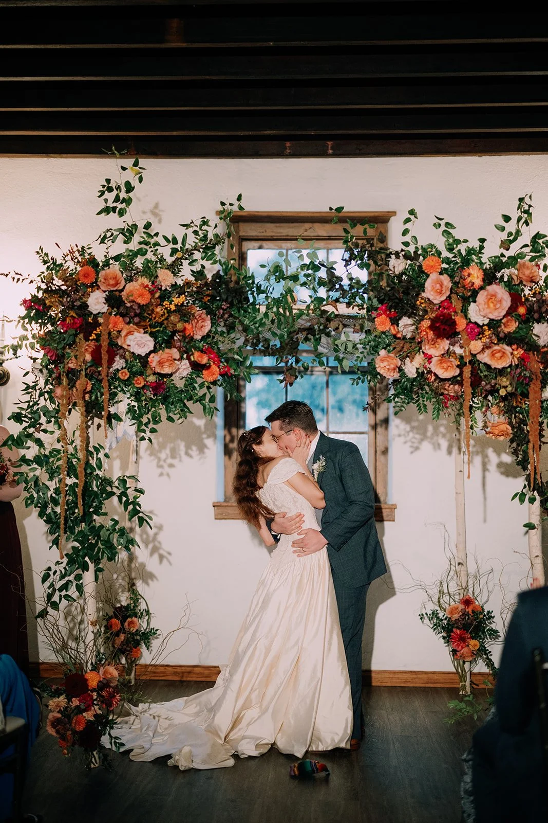 The color palette for this wedding was absolutely dreamy… Apricot, orange, peach, and soft pink blended together in muted, earthy tones that created an inviting atmosphere. The ceremony florals were playful and lush, setting the tone for the rest of the evening. But one of our favorite details was decorating the reception venue's wooden beams with greenery! This wedding perfectly captured that vintage charm with a fresh, modern twist, proving that when you combine romance with a bit of whimsy and the right color story, the result is magic.